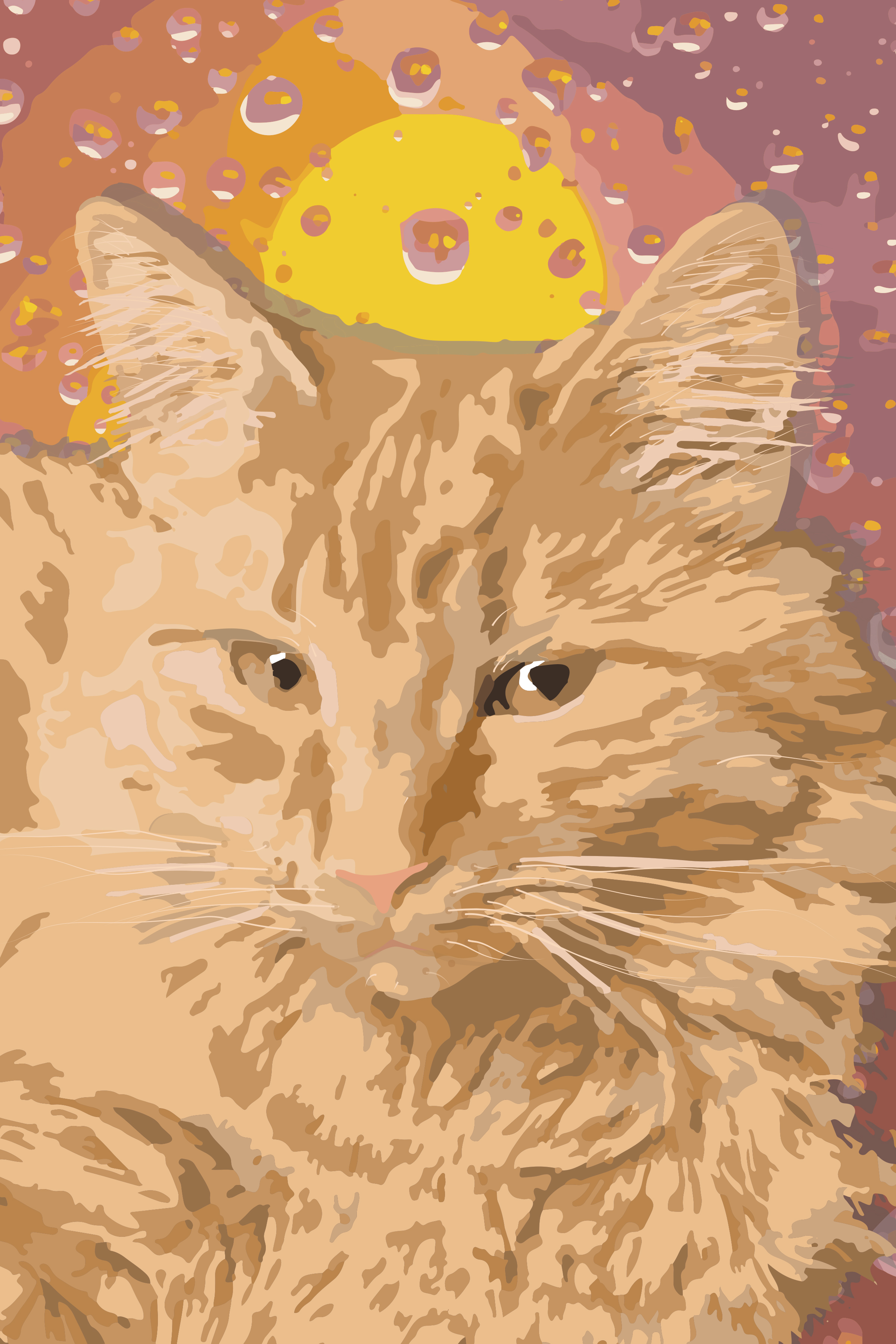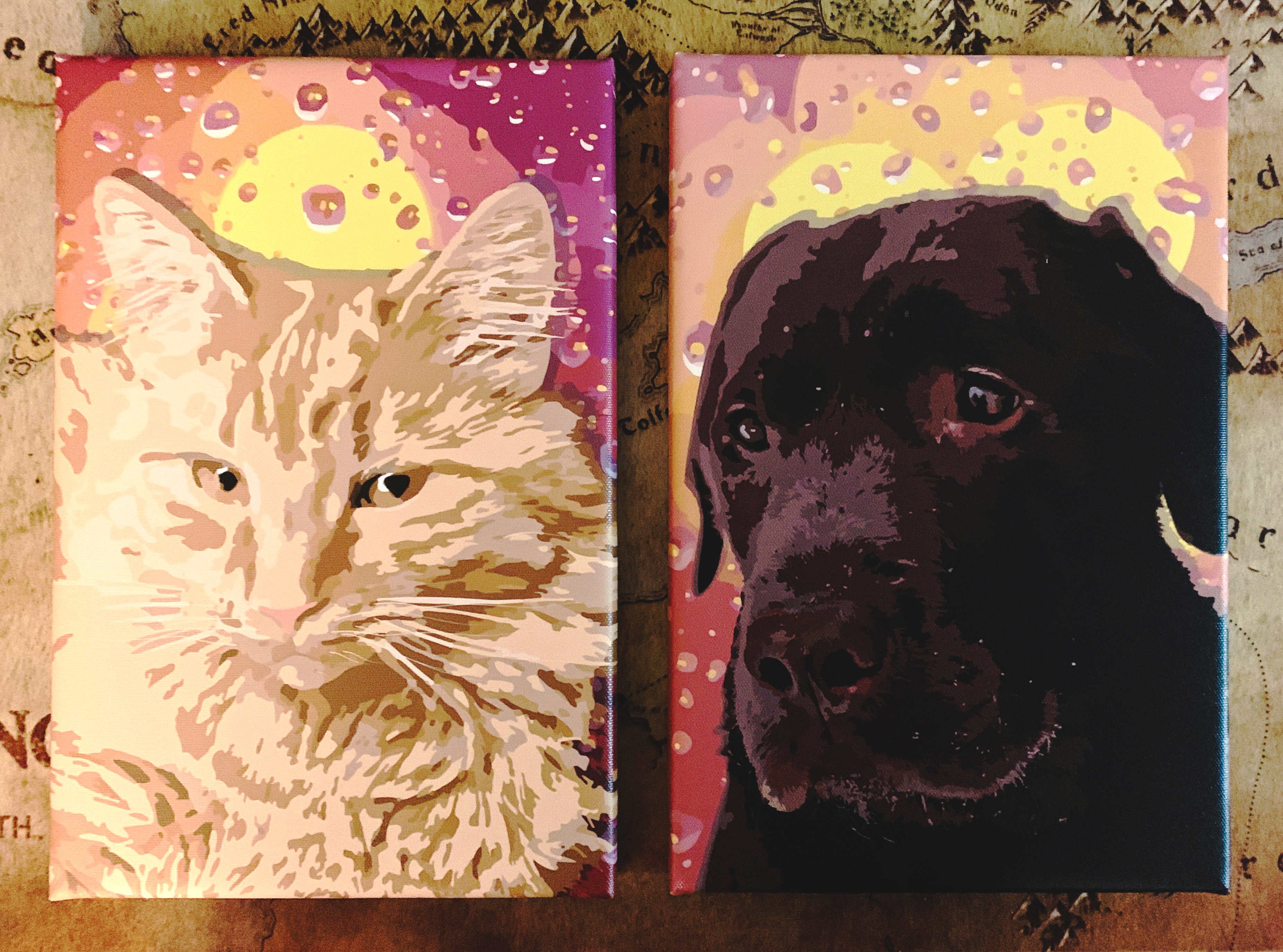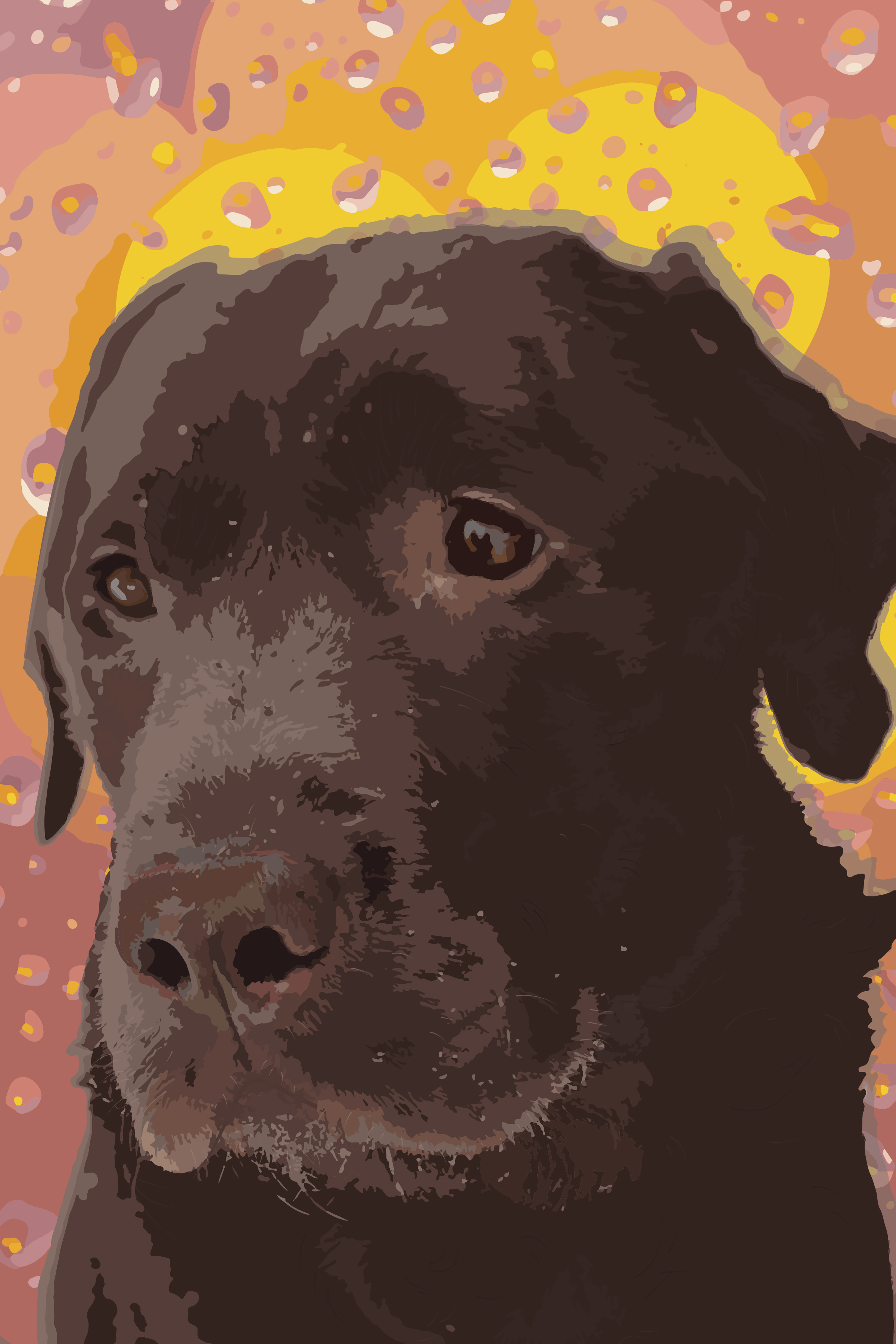 The process for creating this artwork included using reference photos of the subject animal(s). Using the different effects in illustrator, I would refine and create shapes of colour that add texture/realism to the artwork. To create a more contemporary/surreal appeal – I used backgrounds that felt separated from the subject, but still amplified the colour scheme and overall visual. This was especially true for the two pieces that fit together (the cat and chocolate lab).