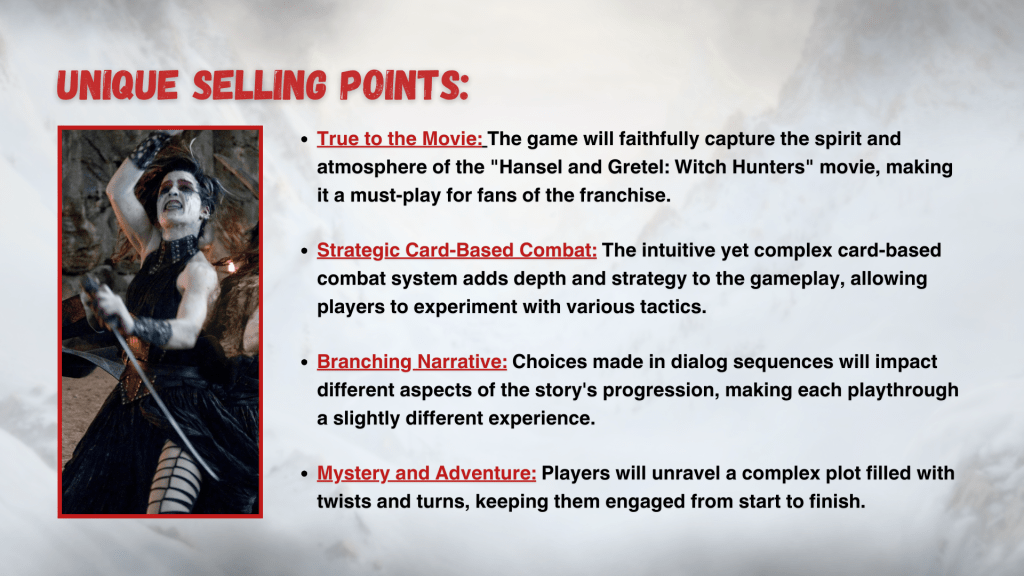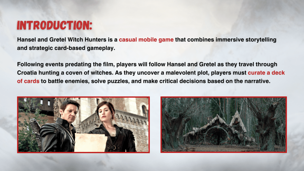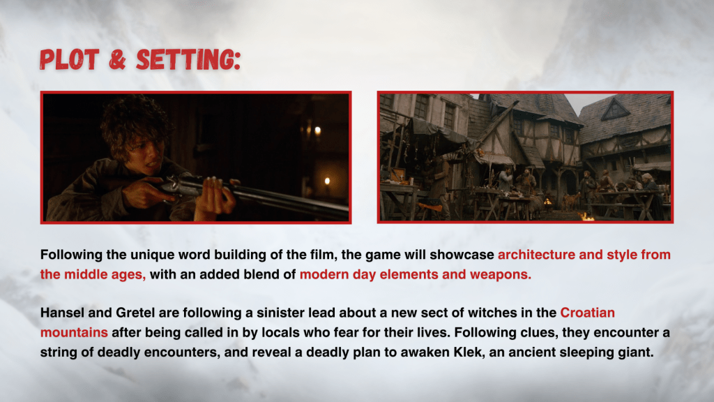 The ‘following ‘Hansel & Gretel – Curse of Klek’ pitch presentation (and supportive visual mockup images) below were created solely by me, and ultimately led to a meeting with Paramount to discuss its potential.