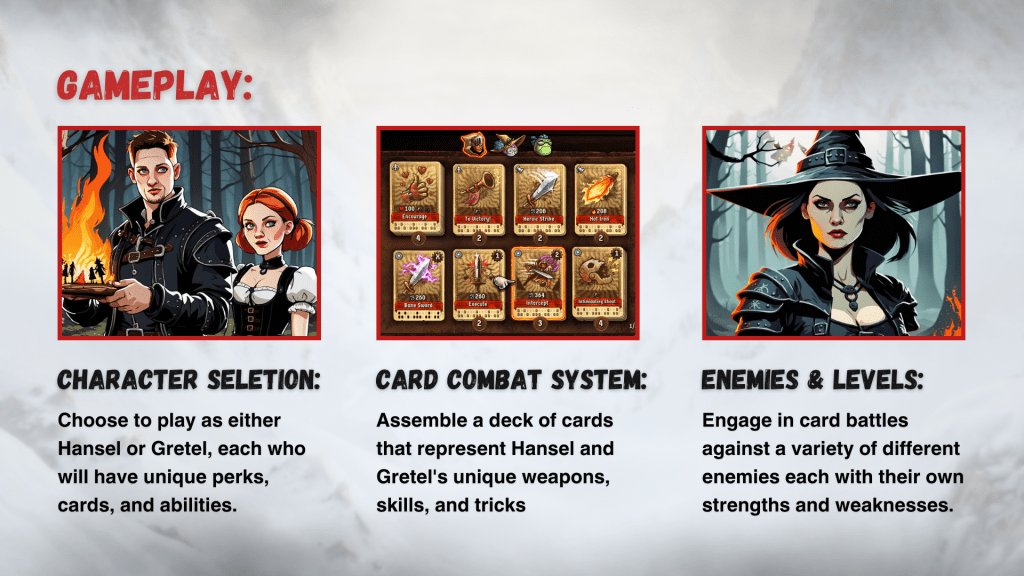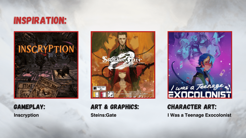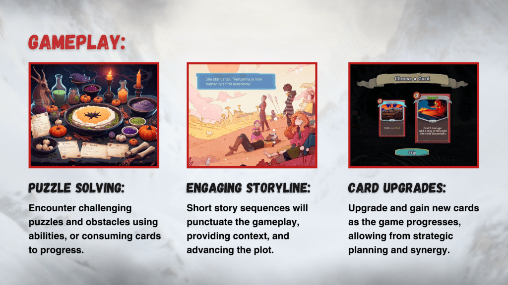 I have also worked on several different game pitch decks, from both idea creation to design support.
